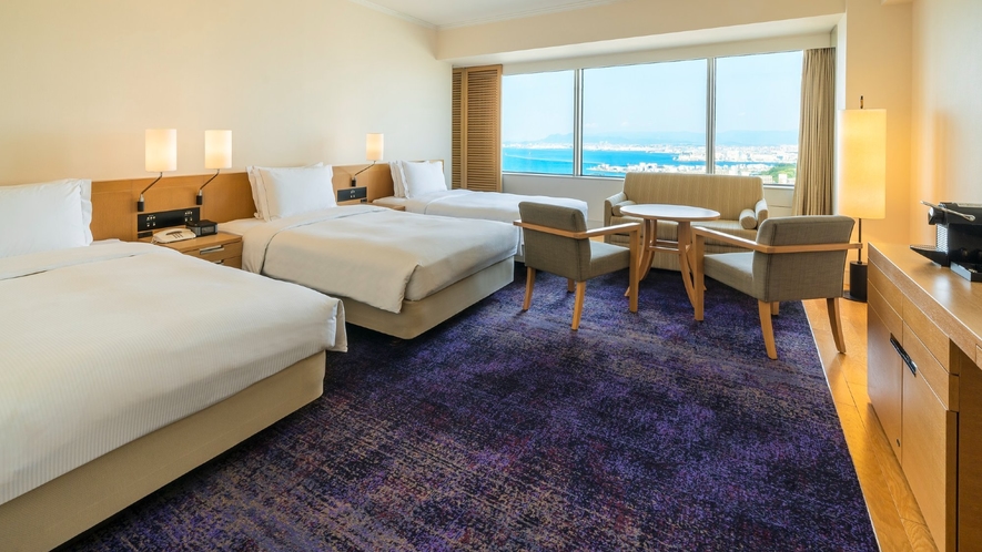 シーホークという名前の通り、客室からは博多湾を望むことができます。上層階のベイビューの部屋は、展望台のような開放感があって、子どもも「海だ!」と大喜びするはずです。